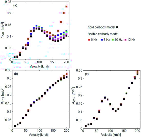 Influence of the carbody vertical bending upon the root mean square of acceleration in correlation with the velocity: (a) at the carbody centre; (b) against the front bogie; (c) against the rear bogie.