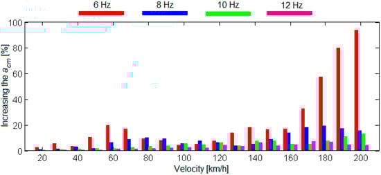 Based on the diagrams in Figure 4, the influence of the vertical bending upon the level of vertical vibrations in the carbody reference points in correlation with velocity is analysed. This analysis is performed by comparing the values of the root mean square of acceleration for the ‘flexible carbody’ model with those corresponding to the ‘rigid carbody’ model. The vertical bending causes the increase of the level of vibrations at the centre of carbody, with this increase being important under certain conditions—high flexibility of the carbody and high velocities (diagram a). This is visible in Figure 5, which features the percentage growth of the root mean square of acceleration for the ‘flexible carbody’ model versus the ‘rigid carbody’ model. As an example, the root mean square of acceleration for the flexible carbody goes up by 93.6% for fvb = 6 Hz at a velocity of 200 km/h compared to the root mean square of acceleration for the rigid carbody. For higher values of the carbody bending frequency, the increase in the root mean square of acceleration does not exceed 20%. As seen in the diagrams (b) and (c), the carbody vertical bending does not sensibly affect the level of vibrations above the bogies, which is valid irrespective of the carbody bending frequency.