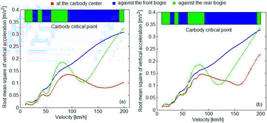 Another interesting aspect to be analysed is related to the manner in which the vertical bending changes the position of the point where the vibrations level is the highest, hereafter called the critical point of the carbody. This can be done based on the diagrams in Figure 6, which show the root mean square of acceleration in the reference points of the rigid carbody (diagram a) and the root mean square of acceleration in the reference points of the flexible carbody for fvb = 6 Hz (diagram b). It is observed that the bending vibration does not change the position of the carbody critical point. For both models, the carbody critical point is located above one of the two bogies, and its position changes as a function of velocity. At velocities smaller than 92 km/h, the carbody critical points alternate either above the rear bogie or the front bogie. A large velocity interval follows afterwards, which extends up to 190 km/h, where the carbody critical point is the reference point situated above the front bogie.