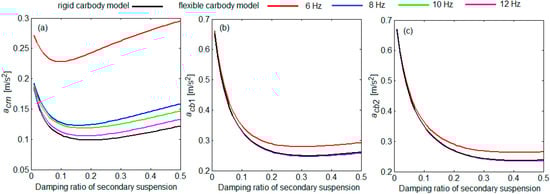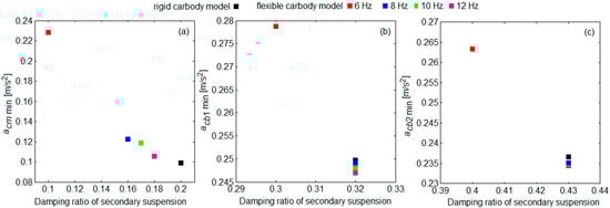 Influence of the carbody vertical bending upon the root mean square of acceleration in correlation with the damping ratio of secondary suspension: (a) at the carbody centre; (b) against the front bogie; (c) against the rear bogie.