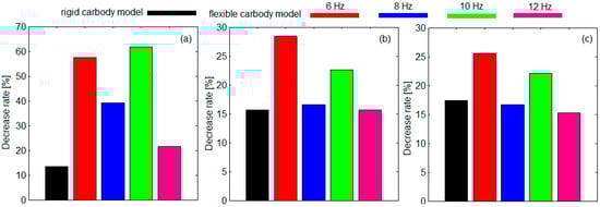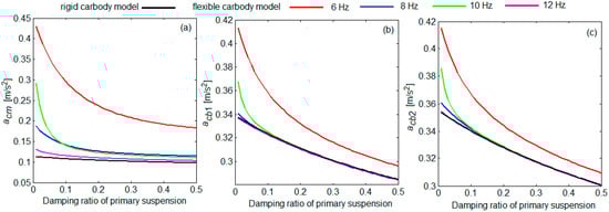 The results show that, for both models, the root mean square of acceleration continuously decreases with the increase of the damping of the primary suspension. The influence of the carbody vertical bending is visible in the decrease rate of the root mean square of acceleration, as shown in Figure 10.