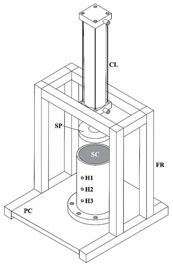 Designed compost compact device used in this study. Legend: PC—base and platen cover; SC—PVC sample cylinder; FR—steel frame; CL—cylinder; SP—steel piston; and H1, H2, and H3—holes over cylinder used to measure the thermal properties.