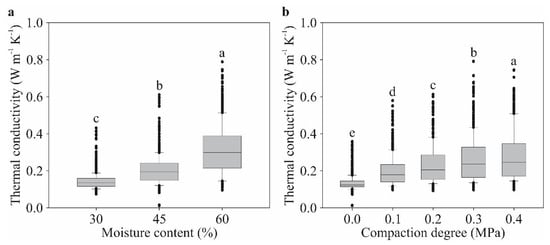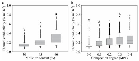 Variation in thermal conductivity (k) at different degrees of moisture content (a) and (b) static compaction degree of compost bedding materials. Values followed by different letters are significantly different (p < 0.05; Tukey).