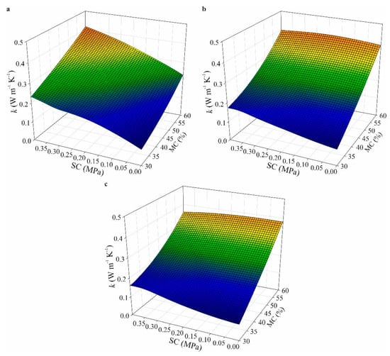 Therefore, increasing the moisture content, the pores of the bed material were filled with water, which increased the values of k. In addition, k also increased with the increased degree of SC due to a reduction in empty space. Generally, the thermal properties of composting materials show specific tendencies related to water content, apparent density, and particle size [,,,]. If water content increases, the volume fraction of air decreases, and the volume fraction of solid increases. Consequently, the bulk thermal conductivity increases []. In other words, if SC and MC increase, solid particles move closer to one another, and the thermal contact resistance between bed particles decreases, thus raising the k values.