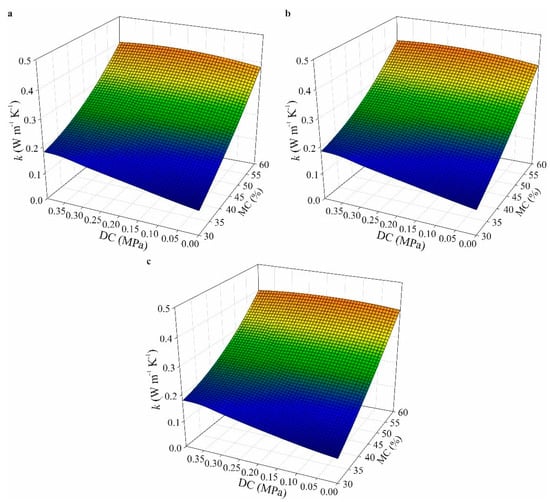 As can be observed in Figure 6, k presented higher values with a 60% MC and a DC of 0.4 MPa (0.789 W m−1 K−1). Theoretically, these values of k can be predicted, since the DC over time has a direct effect due to the increase in the apparent density of the bedding material, reducing the porosity and resulting in an increase in k values. The thermal conductivity of leaf compost increased linearly with the increase in water content and compaction degree, represented by volume fractions of air [].