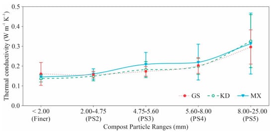 As can be observed in Figure 8, the values of k increase with the increase in the PS of the analyzed materials, which is the reverse of what was expected, as described by Yun and Santamarina [] and Ahn et al. []. According to Singh et al. [], the porosity has a great influence on the thermal properties of the material due to its dependence on the PS, that is, as the PS increases, the thermal conductivity decreases, since more particles are required for the same porosity, meaning more thermal resistance between the particles. This behavior can probably be explained by the higher retention of moisture in larger particles since the compost bedding materials were air dried for the same period of time and because the materials had different PSs, so drying did not occur evenly, which probably influenced the values of the thermal properties. Considering the physical mechanism associated with conduction in general, the k of a solid is greater than that of a liquid and that of a liquid is greater than that of a gas []. Thus, the effect of PS on the k was more pronounced on larger PSs. However, a small increase in k for all materials was observed when PS was less than 4.75 mm. It was also observed that k increased dramatically (>85%) in materials with a PS greater than 8.00 mm (Figure 8). These changes can be explained considering the change in porosity filled with fine particles of material. For grain-like materials, for example, where the pores of the materials are filled with air, generally the k increases as the PS decreases. However, in materials with large particles, the k presents inverse results [].