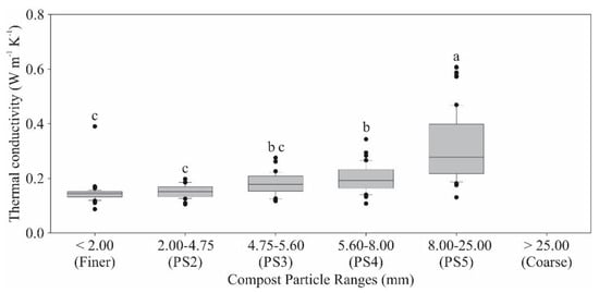 Variation in thermal conductivity (W m−1 K−1) and compost particle ranges (mm) for bedding materials. Values followed by different letters are significantly different (p < 0.05; Tukey test).