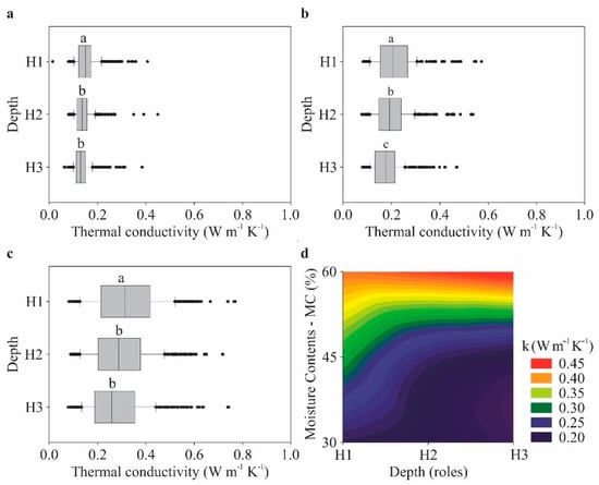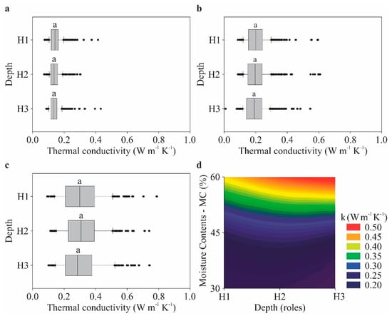 The values of k increased with SC due to a reduction in void space and an increase in bulk density (Figure 10). However, statistical analysis revealed that depth alone did not have a significant impact or interaction with another factor. In general, the values of k reduced along the evaluated depths, presenting higher values at depth H1. This upward trend was contrary to the study by Huet et al. [], where it was found that depth alone did not have a significant impact or interaction with other evaluated factors (MC and PS) in thermal conductivity values.