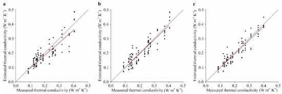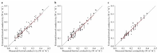 Through a preliminary statistical analysis, it was found that there is no statistically significant difference between the estimated thermal conductivity (kest) and (kmea) measured (t test, p > 0.05). The adjusted expressions are statistically significant (F test, p < 0.0001), providing mean errors of 0.065, 0.077, and 0.077, respectively (Figure 12).