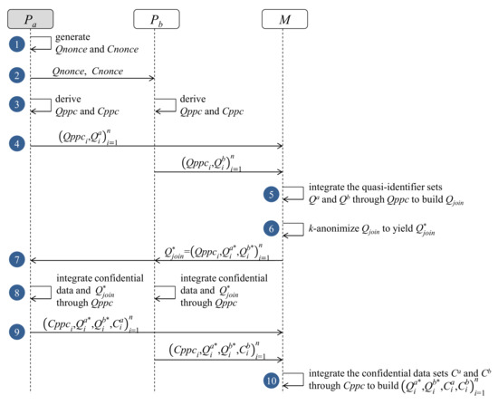 Anonymization and integration protocol in a scenario with two data providers, and , and a mashup coordinator, M. The provider acts as a leading provider.