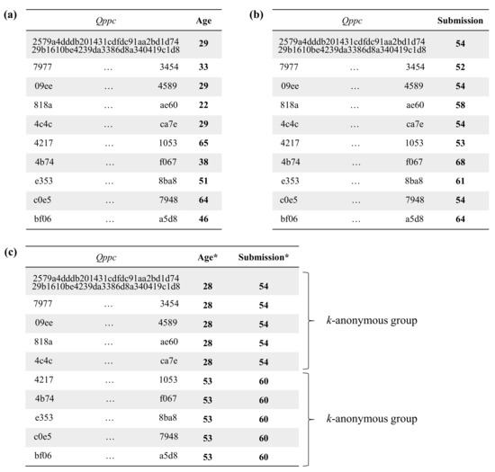 The dual need to share information and protect privacy at the same time has been extensively addressed in the field of Privacy-Preserving Data Publishing (PPDP) [15,17] and, more recently, in e-learning systems [18]. A variety of PPDP methods have been proposed to mitigate the risk of re-identifying the data subjects and, in turn, yield protected data that is still useful for specific statistical analyses. Some well-known methods, such as microaggregation [19] or generalization [20], enable data k-anonymization. By k-anonymizing a dataset, each QI is altered—or masked—to make it indistinguishable from the QIs of other individuals, thereby reducing the probability of re-identification to [20]. The k parameter is used to control the masking level: the higher the k, the higher the masking level—and, consequently, the greater the anonymity degree—but the less valuable the anonymized information will be for statistical analysis.