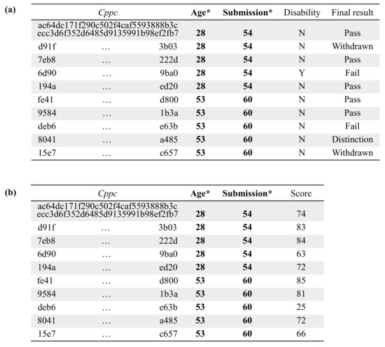 - Kuzilek, J.; Hlosta, M.; Zdrahal, Z. Open University Learning Analytics dataset. Sci. Data 2017, 4, 170171. [Google Scholar] [CrossRef] [Green Version]
