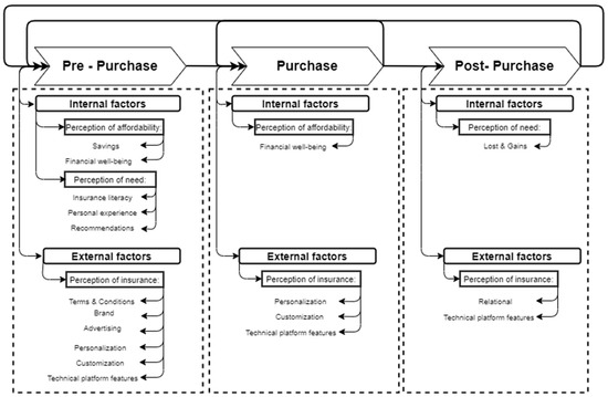 Modern insurance specific value chain and co-creation activities depend on features of the core offering-purchase stage, but are also shaped by numerous internal and external factors: customer sourcing processes and an organization role within customer operations, high-level factors of sociodemographic and socioeconomic characteristics, insurance literacy, platform design and information layout, and social media and reality [12,13,17,19,24,25]. Figure 1 summarizes key elements and processes of insurance decision-making.