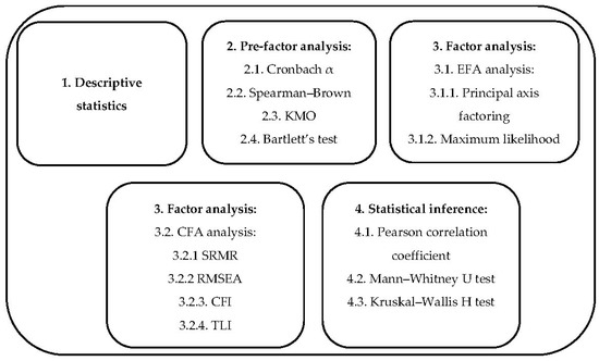A combination of statistical techniques, involving descriptive statistics and factor analyses, are recommended within the applied research to simplify an interpretation of quantitative variables and, overall, to ensure a comprehensive examination of the empirical dataset [58]. This type of multi-level qualitative and quantitative analysis allows researchers to examine the validity of theoretical constructs and the consistency of research instruments, sampling adequacy, and underlining structures and relationships among latent variables (factors) [58,59]. The selected forms of the descriptive statistics involved a manual calculation of a simple and grouped frequency distribution and measures of central tendency. The factor analysis was conducted with the SPPS statistical software (version 26) by completing exploratory factor analysis (EFA), confirmatory factor analysis (CFA), and Pearson’s correlation analysis. The logical sequence of statistical analysis procedures is presented in Figure 2.