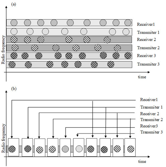 The models of multi-access communication systems: (a) Frequency division multiple access (FDMA); (b) Time division multiple access (TDMA).