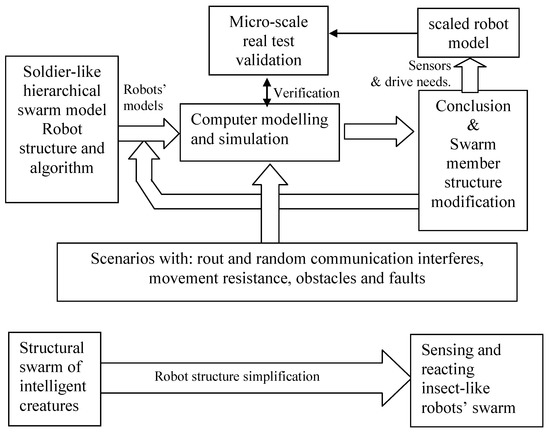The starting point was the model of a soldier-like structural swarm. This model was verified with a computer model and real tests with simple scenarios. In the next steps, the model of the individual robot was simplified and homogenised. Each model was tested by a simulation. Some elements of the scenarios and simulation results were validated by real tests. The process consisted of many iterations.