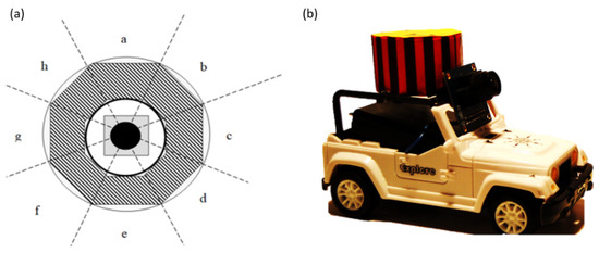 (a) The location of distance detectors with markers of the assumed distance between robots. (b) A photograph of a real model with a marker.