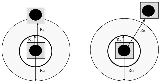 The other regulator used was a model with hysteresis, or a death zone. If the distances between the robots were within the zone between Rm and RM, the required speed could be calculated as follows: