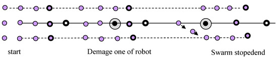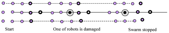 A group of soldiers is a hierarchical structure featuring a superior and subordinates. The commander leads the team. The team moves in an array formation (rows and columns) [17]. The members try to stay at a particular distance from their neighbours in front and to the side, and to stay in a line. However, those in the first row only have one person ahead of them—the leader—who should be in the centre, at the front. A robot’s position in the array is fixed. During turning, the robots have to adjust their speed in order to keep in line. Finding the algorithm for such an action is not difficult, but we needed quite a complicated sensor system with actual state evaluation. For the next simulation, if one of robot fail, the formation matrix needed to be reconfigured. In other words, the robot needed to be ready to change its position and algorithm of action. The potential for error applies to all robots, including the leader. If any robot can play any role, then all of them have to be equally advanced. Paradoxically, the leader can be prepared for only one role. For a hierarchical swarm, we assumed that its structure would be reconfigurable during movement, that obstacles would be avoided by the leader, and that the others would follow suit.