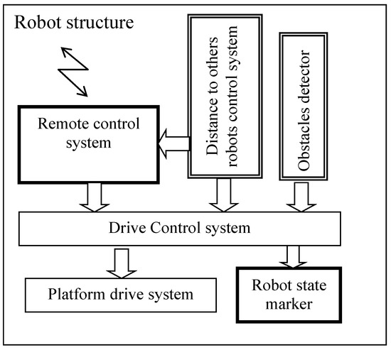 During the literature review, we found more questions than answers about insect behaviour and how it can be transferred to the robot world; instead, therefore, we started with the most advanced structure. Initially, the hierarchical swarm model was built based on soldier formation movement in a matrix. Although it consisted of the most intelligent creatures, it was the easiest to analyse because the authors are experienced in military service. Therefore, it was easy to build a logical model and an algorithm for swarm behaviour. For these analyses, some typical scenarios were prepared. These scenarios described the movement conditions and required paths. These movements were planned to be performed in a straight line and in curves, in various formations, such as in single file or in a matrix. The algorithm for an individual robot’s movement depended on its role in the swarm. Its task was to maintain its position in the swarm. In various scenarios, the formation was changed. During algorithm building, the information needed for robot and drive skills was defined. This information was delivered with control signals or by sensors.