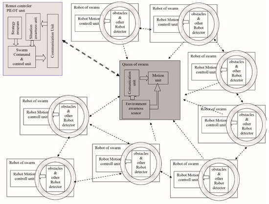 Initially, the robot swarm based on a soldier array seemed to be easily controlled by controlling the leader. The intelligence of the leader would control the whole swarm. Initially, the structure with a leader was assumed to be the most complicated, but the need for following the leader and avoiding obstacles by followers and the importance of ensuring the swarm fault tolerance meant that the slave robots became more complicated. The leader, which is controlled by the operator, can be the least advanced robot in the swarm.