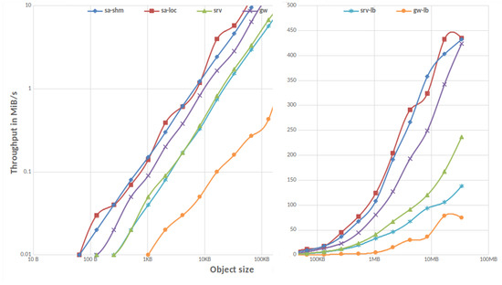 The results show that for objects with size greater than 1 KB, MinIO performance—even in this ideal setup—is significantly lower than the base REST performance and that there is room for improvement, which we address in Section 4.