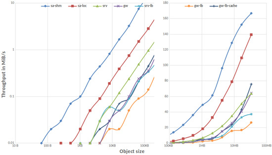 To understand performance limitations, we plot the throughput of various transfer modes using one node and four processes in Figure 6. The figure includes performance numbers from [23], where the base performance of REST/HTTP is analyzed by emulating a best-case client/server scenario: The throughput of the HTTP GET operation—representing read-only access to a storage server—is calculated for different file sizes. We conduct the same experiments on Mistral, using tmpfs as backend. Since the tests are accomplished against localhost, we can compare the obtained results with the IOR results of the single client MinIO setup described in Section 3.1.1, where MinIO is running in standalone mode with RAM as backend, and using 1Node-4PPN as well. We also include: