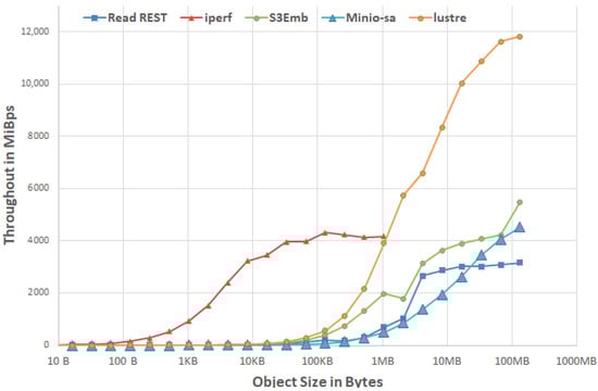The results delivered by S3Embedded are very close to the ones obtained for the Lustre direct access—mainly for files larger than 32 MB—far superior to the ones supplied by MinIO-local-gw, they are also free from timeout errors.