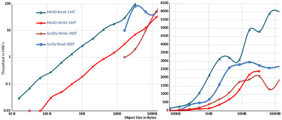 Throughput of Scality Ring and MinIO on 3 nodes.