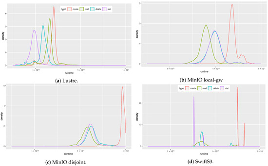 MD-Workbench reports not only the throughput, but also the latency statistics for each I/O operation. The density of the individually timed operations is plotted as shown in Figure 8. A density graph can be considered a smoothed histogram where the x-axis shows the observed runtime and the y-axis represents the number of occurrences.