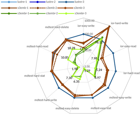 The radar chart in Figure 10 shows the relative performance of S3embedded and S3remote in percent for three independent runs of all benchmarks. Note that the three Lustre runs are so similar that they overlap in the figure. The graph clearly shows the performance gaps of the two libraries. For the sake of comparison, all relative performance numbers for the run with s3embr-3 are listed. Only for the ior-hard-write phase, the number is close to 100%, while it often achieves 5–10% of Lustre performance. The embedded library also lacks performance for some benchmarks, but is much better.
