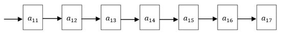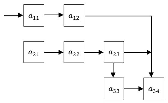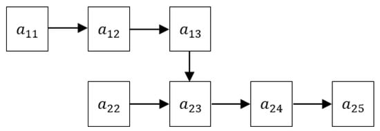 Each workstation requires a skill, which is denoted as , , ..., . A matrix describes the relationship between skills and operators. For example, indicates that operator possesses skill . For the assembly line in Figure 3 to function, the minimum matrix must be as follows: