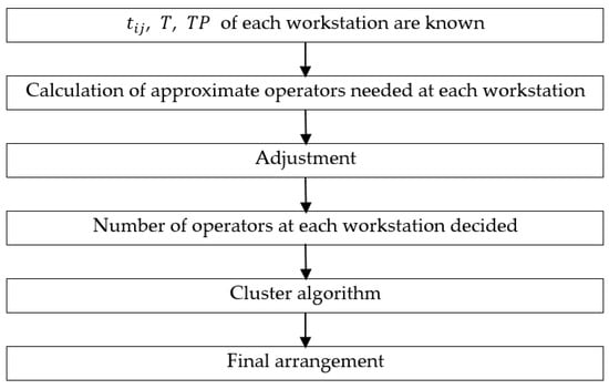 Many ALBP methods have been examined in the study of manufacturing systems, including the heuristic algorithm [,,,,,,,,], artificial bee colony algorithm [,,], genetic algorithm [,,], branch-and-bound algorithm [,,,], imperialist competitive algorithm [], Pareto Greedy algorithm [], memetic ant algorithm [], whale optimization algorithm [], recursive algorithm [], fuzzy linear programming [], swarm algorithm [,], simulated annealing algorithm [], and data envelopment analysis []. The genetic algorithm [,] and artificial bee colony algorithm [] have been used to solve the ALBP in remanufacturing systems. However, studies have seldom discussed how to arrange operators and group similarly skilled operators at the same workstation. This paper considers workers, not machines, in determining whether a workstation has the right equipment and machinery for operators to use. To achieve this goal, the study works out a method for rapidly balancing assembly lines by arranging operators among the workstations and uses a robust, cluster algorithm based on the concept of group technology (GT) to form operator skill cells and determine operator families.