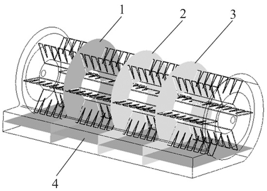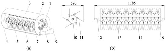 The recovery of residual film before sowing is the main recovery method []. The residual film is mostly fragmented and distributed on the surface and shallow soil, so the recovery of residual film is difficult, and the recovery effect is not ideal [,]. To solve the problem of residual film recovery before sowing, China has developed a variety of residual film recovery machines []. The film removal device is not only the core working part of the residual film recovery machine, but also the main difficulty in the development of residual film recovery machines []. At this stage, there are relatively few studies on film removal devices, mainly including the pneumatic type [], telescopic rod tooth type [] and stripping blade type []. The structure of the pneumatic stripping device is relatively simple. The main working component is the fan. During operation, the film removal mainly depends on the force of the air flow on the residual film, but the film removal effect is not good [,]; the telescopic rod tooth removal device mainly depends on the expansion and contraction of the elastic teeth on the eccentric roller to pick up and remove the film. It has high development cost and low reliability []; the stripping blade type removal device mainly adopts a method in which the rotating direction of the working part of the film removal device is the same as that of the film picking device, the film removal rate is not high and the film wrapping phenomenon easily occurs on the film stripping blades [].