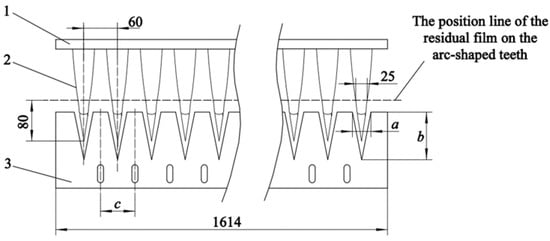 The design of the tooth profile of the blade has a direct impact on the film removal effect, which is based on the structural parameters and arrangement of the arc-shaped teeth. As shown in Figure 3, the design of the tooth profile of the blade includes the determination of three parameters , and . The tooth profile of the blade is designed as an isosceles trapezoid. The arc-shaped teeth are installed in a staggered arrangement, and the distance between the adjacent arc-shaped teeth is 60 mm. For , is the distance between adjacent teeth. According to the working principle of film removal, the arc-shaped tooth needs to pass through the adjacent teeth of the blade. It is necessary to ensure the distance between the adjacent arc-shaped teeth such as the distance between adjacent teeth. Therefore, should be 60 mm. For , is the tooth height of the blade. In the process of film removal, the tooth height of the blade should ensure that the blade can reach the area where the residual film is located. As in the pretest of the film picking device, the research group found that the residual film was mainly concentrated approximately 80 mm from the arc-shaped tooth tip in the vertical direction, and the width of the arc-shaped tooth at this position was 25 mm. Therefore, and when b is 120 mm, the requirement of film removal can be met. For , is the maximum distance between the teeth of adjacent blades. When the value of is too large, the arc-shaped tooth passes through the blade and cannot play the role of film removal, so 25 mm. If the value of is too small, the blade deforms greatly, and the force on the residual film on the arc-shaped tooth is large during the operation, which is conducive to film removal, but easily causes residual film entrainment on the film removal blades. Therefore, to sum up, mm is suitable for the design.