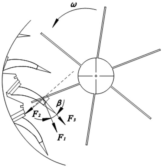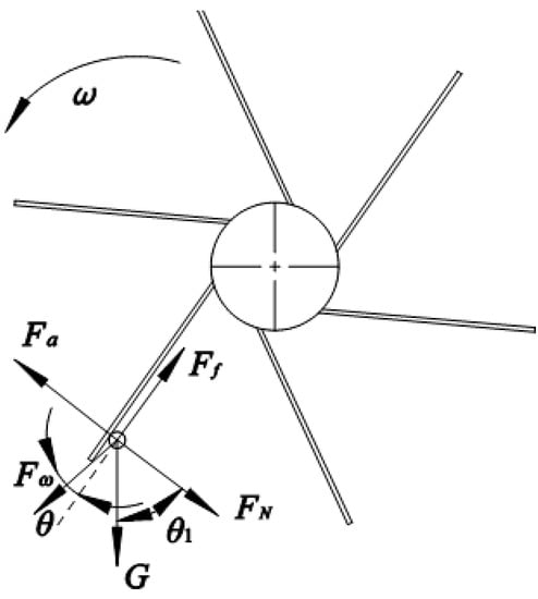 To separate the residual film from the blade, it is necessary to ensure that the centrifugal force of the residual film at the end of the blade is greater than the adsorption and winding force between them []. Due to the easy adsorption and floating of the residual film, the resistance effect of airflow should be considered in the motion analysis of the residual film []. Figure 5 shows the instantaneous force analysis of residual film separation.