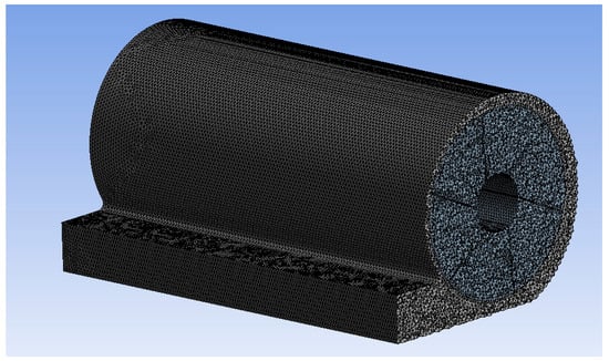 The relevant settings of the simulation process are as follows: the multiple reference system model is selected, the moving area of the vane type film removal roller is defined as the rotating area, the rotation speed of the vane type film removal roller is given as 200 r/min, and the remaining area of the model is defined as the static area. To better show the phenomena of airflow and vortex inside the film removal device, the Realizable k-ε model is used []. The pressure–velocity coupling method uses the SIMPLE algorithm (Semi-Implicit Method for Pressure Linked Equations) [,], and the momentum equation, turbulent kinetic energy and other discrete formats are all used in the second-order upward style. The inlets on both sides are set as pressure inlets, the surface of the film removal area and the surface of the film conveying port are set as the pressure outlets, and the reference pressure is set to standard atmospheric pressure.