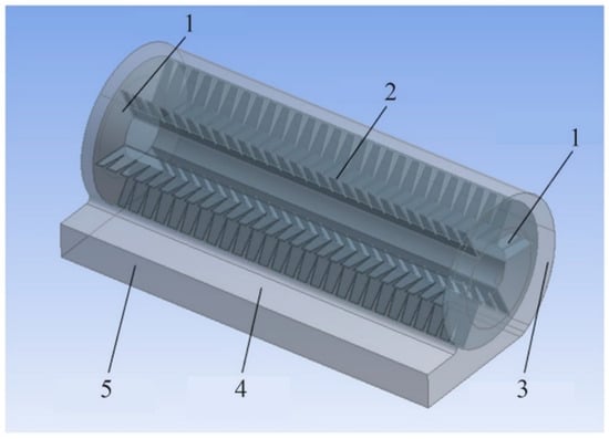 Schematic diagram of simplified model. 1. Inlet. 2. Rotating area. 3. The surface of film removal area. 4. Static area. 5. The surface of film conveying port.