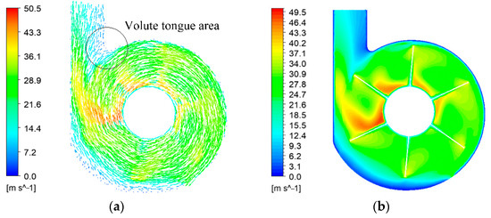 Velocity vector diagram of cross section 1 (a) and velocity nephogram of cross section 1 (b).