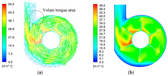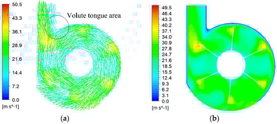 Velocity vector diagram of cross section 2 (a) and velocity nephogram of cross section 2 (b).
