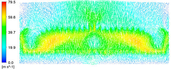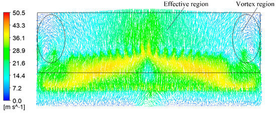 Based on the processing conditions of the factory, this paper uses the optimization function of the Design-Expert software to optimize the regression model []. In the optimization process, the constraints on the test factors are as follows: the rotating speed of the vane type film removal roller is 100 r/min~300 r/min, the inclination angle of the blade is 5°~25°, the diameter of the roller is 140 mm~219 mm; evaluation index: area ratio, takes the target minimum value. The final optimized parameter combination is as follows: the rotation speed of the vane-type film removal roller is 283 r/min, the inclination angle of the blade is 25°, the diameter of the roller is 219 mm, and the area ratio is 9.84%. Under the optimal parameter combination, velocity vector diagram of cross section 4 is shown in Figure 16.