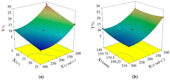Figure 15a is the response surface diagram of the interaction between the inclination angle of the blade and the rotation speed of the vane-type film removal roller to the area ratio when the diameter of the roller is at the zero level (179.5 mm). Figure 15a shows that in the direction of the inclination angle of the blade, the area ratio gradually decreases as the inclination angle of the blade increases. In the direction of the rotation speed of the vane-type film removal roller, the area ratio first decreases with increasing rotation speed of the vane-type film removal roller, and then the range of change tends to be flat. The response surface changes greatly along the direction of the rotation speed of the vane-type film removal roller. In addition, at the zero level, compared with the effect of the inclination angle of the blade on the area ratio, the effect of the rotation speed of the vane-type film removal roller on the area ratio is more significant.