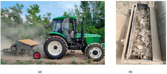 To ensure the accuracy of the test, the residual film and the mixture of film and impurities (broken cotton stalk) collected during the investigation were randomly laid on the surface of the soil and a shallow layer of soil with a depth of 0–100 mm. The test field was artificially simulated based on the data from the previous field survey to recover the environment of the residual film before sowing and the parameter settings of the test field are shown in Table 2. The test equipment included a Tiantuo TN954 tractor (Tianjin Tractor Manufacturing Co., Ltd, Tianjin, China), an electronic scale (model: JE3001, Shanghai Shengke Instrument Equipment Co., Ltd, Shanghai, China), a soil moisture meter (model: TDR300, Beijing Bolun Jingwei Technology Development Co., Ltd., Beijing, China), and a tape measure.
