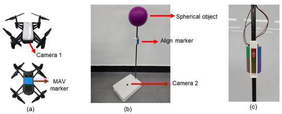 MAV and landing system. (a) MAV with camera and bottom marker; (b) landing platform with a spherical object, align marker, and camera; (c) align marker.