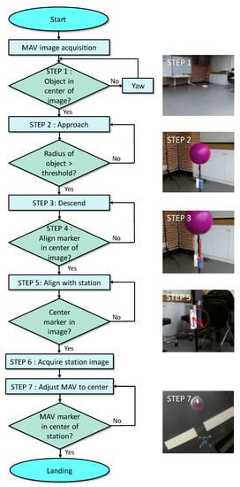 When the MAV approaches the platform (STEP 2), the radius of the spherical object in the image is detected and is used to estimate the distance between the MAV and the platform. The align marker used in STEP 5 is a cylindrically shaped object; three different-colored markers are located on its surface. Thus, depending on the detected marker color, the MAV determines the direction of rotation. To improve the accuracy of the alignment, the marker is designed as follows: when the MAV is perfectly aligned with the platform, only the center marker is captured, and the other two markers are invisible. To this end, thin walls are attached around the center marker, as shown in Figure 1c. This design enables the MAV to detect only the center marker when it is aligned. However, the shadow of the thin wall falls on the center marker. Thus, a light-emitting diode (LED) was installed near the third marker to prevent detection failure. For the detection of the align marker and the marker attached to the bottom of the MAV (STEP 5 and 6), HSV filter-based detection was used. Figure 2 illustrates the overall landing procedure.