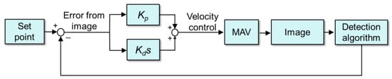 The MAV is controlled by seven velocity commands (forward, backward, left, right, up, down, and yaw) for maneuvering. Note that the MAV was controlled using the position data (in pixels) from the camera images. For example, when the MAV approaches the platform (STEP 2), the position of the spherical object (in pixels) in the image is selected as the reference position. A proportional-derivative (PD) control was used to allow a swift flight control of the MAV, as shown in Figure 3. Thus, the velocity command can be obtained as
