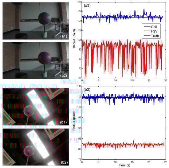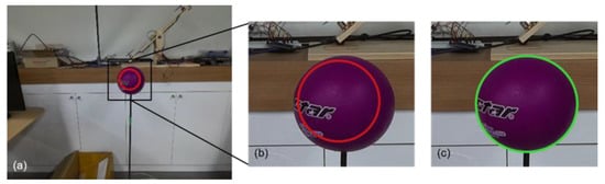 First, the newly developed algorithm conducts both HSV filtering and the circle Hough transform (CHT) [33]. In general, CHT is more accurate than HSV filtering; however, HSV filtering is faster than CHT. Furthermore, CHT cannot detect a spherical object when there is a large number of edges, which are irrelevant to the spherical object. Moreover, the detection fails when the edge of the object is blurred in the captured image due to the sudden movement of the MAV. To overcome these accuracy and latency issues, both HSV filtering and CHT are used in the new algorithm.