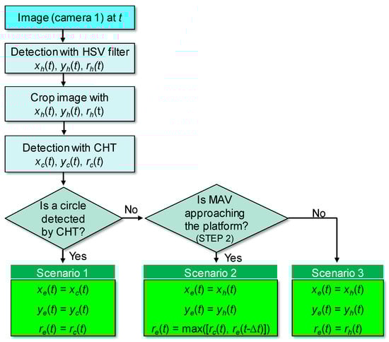 This hybrid detection algorithm (shown in Figure 6) was used to detect the spherical object and not the align marker. During detection of the sphere installed at the landing platform, the distance from the MAV to the sphere is considerable, and other objects can be captured in the image. To reduce the possibility of misdetection, the pass range of the HSV filter must be narrow. However, only a portion of the spherical object would be detected because of this narrow band (for the HSV filter). Thus, cropping, the scenario-based method and CHT were combined to detect the sphere. Meanwhile, during detection of the align marker, the MAV is very close to the station. Thus, the align marker occupies most of the image area, and interference by other objects in the background is very small. A broad HSV range can thus be used for the align marker, hence the hybrid detection algorithm was not necessary.