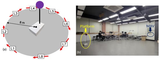 To test the effects of the MAV starting position on the landing results, the MAV started at eight different locations (i.e., L1–L8), as shown in Figure 8a. The distance between the MAV starting position and the platform was set to 8 m; this distance was chosen because it was similar to the GPS navigation error. Initially, the angle between the MAV and the platform was set as 90° with respect to the orientation of the platform in order to test the search motion (STEP 1); the setting direction of the MAV is represented by arrows in Figure 8a. Ten experiments were conducted at each initial position while recording the time required for autonomous landing and the landing spot. The supplementary videos (Video S1) show the entire landing procedure.