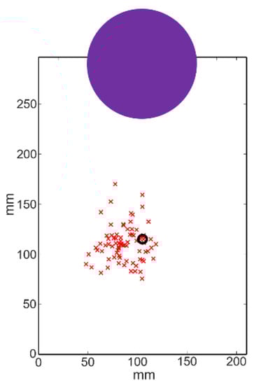Landing spots on the A4-paper-sized platform; the black circle represents the reference landing position, and the red crosses are the actual landing spots.